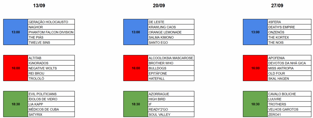 Visando a melhor experiência possível ao público e aos músicos participantes, cada data é subdivida em 3 bloco com início às 13h, 16h e 18:30h.